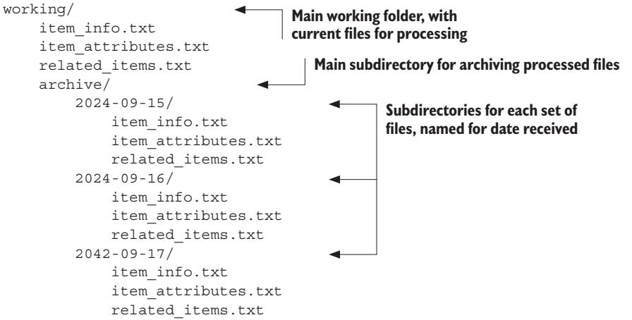 Now assume that you get three related files every day: item_info.txt, item_ attributes.txt, and related_items.txt. These three files come in every day and get processed. If processing were the only requirement, you wouldn’t have to worry much; you could just let each day’s set of files replace the last and be done with it. But what if you can’t throw the data away? You may want to keep the raw data in case there’s a question about the accuracy of the process, and you need to refer to past files. Or you may want to track the changes in the data over time. Whatever the reason, the need to keep the files means that you need to do some processing.